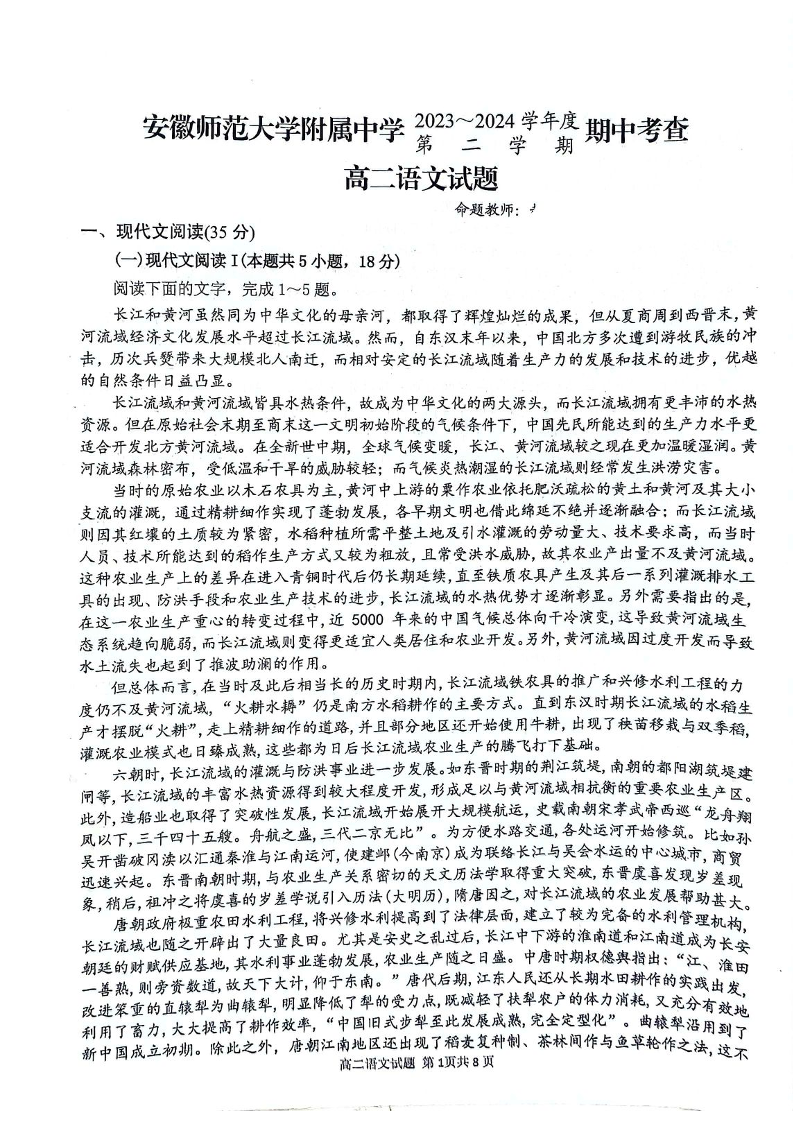 安徽省安徽师范大学附属中学2023-2024学年高二下学期期中考试语文+答案