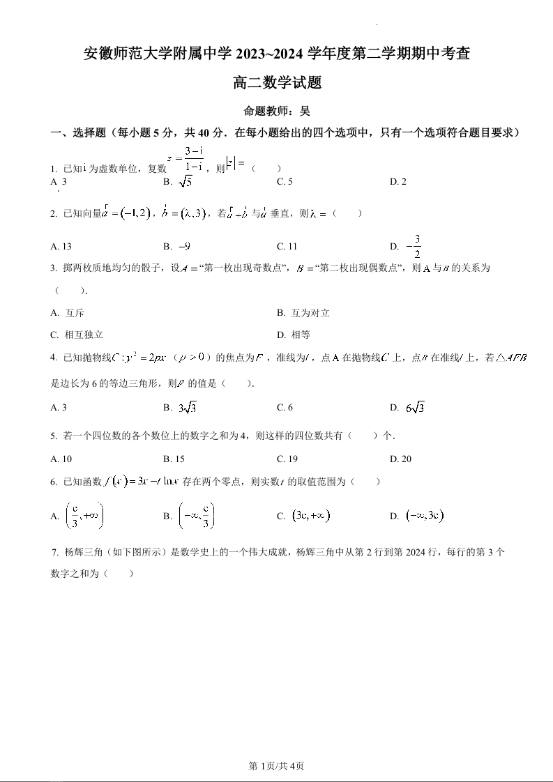 安徽省安徽师范大学附属中学2023-2024学年高二下学期期中考试数学(原卷版)