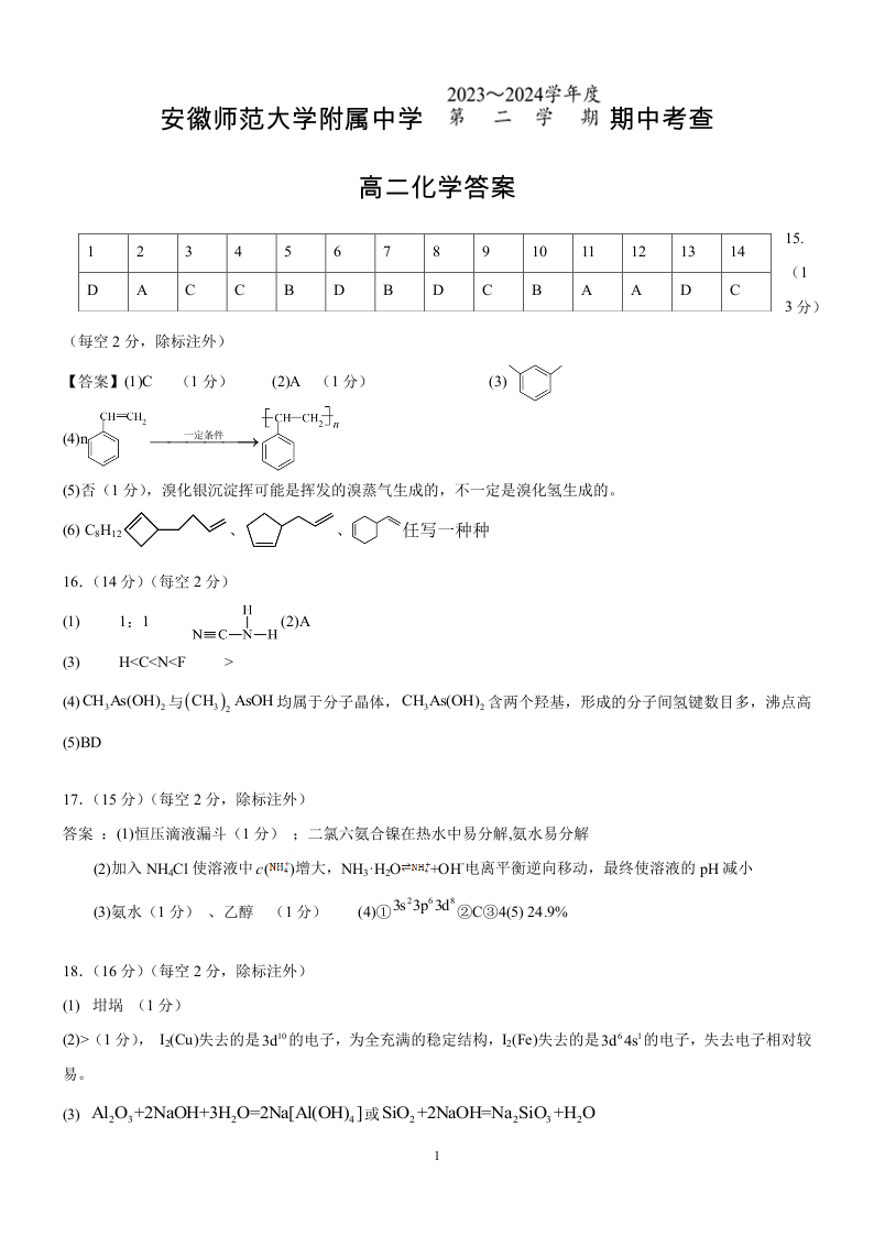 安徽省安徽师范大学附属中学2023-2024学年高二下学期期中考试化学答案