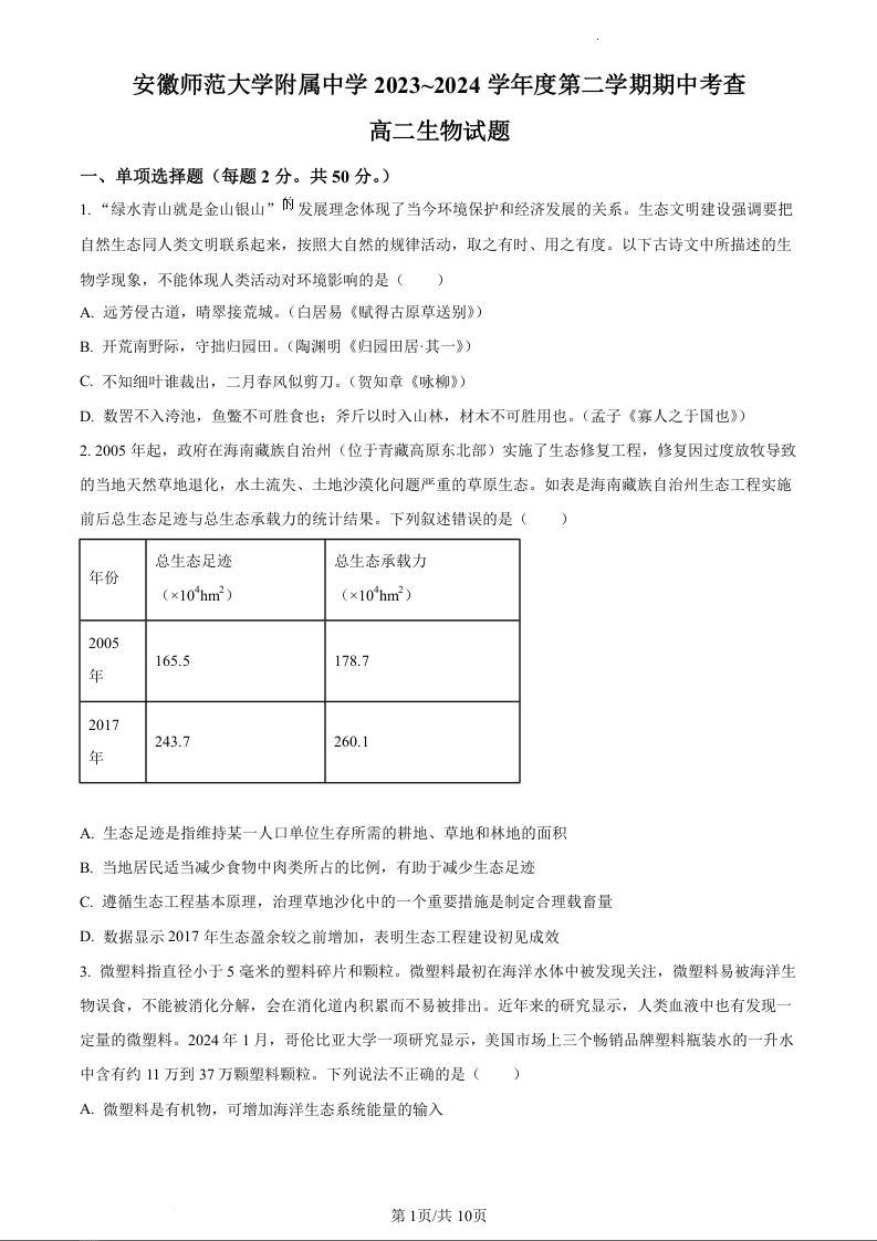 安徽省安徽师范大学附属中学2023-2024学年高二下学期期中考试生物(原卷版)