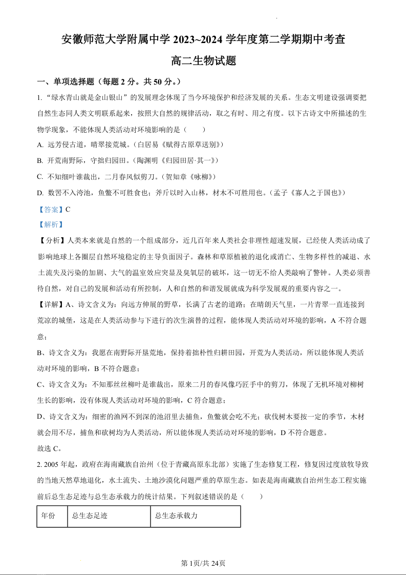 安徽省安徽师范大学附属中学2023-2024学年高二下学期期中考试生物(精品解析版)