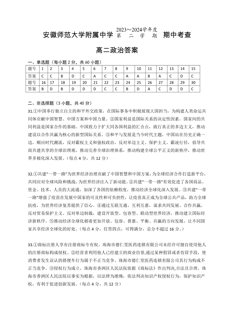 安徽省安徽师范大学附属中学2023-2024学年高二下学期期中考试政治答案