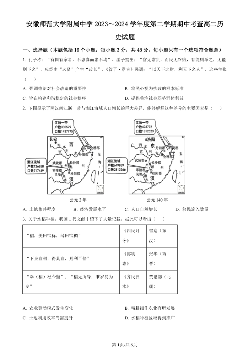 安徽省安徽师范大学附属中学2023-2024学年高二下学期期中考试历史(原卷版)