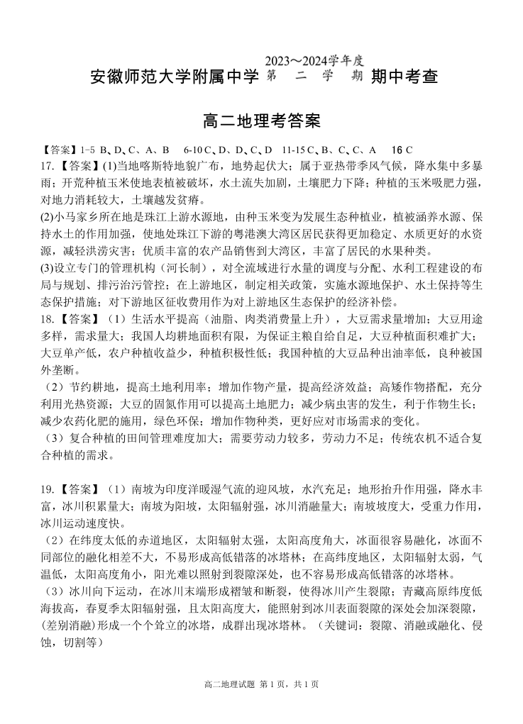 安徽省安徽师范大学附属中学2023-2024学年高二下学期期中考试地理答案