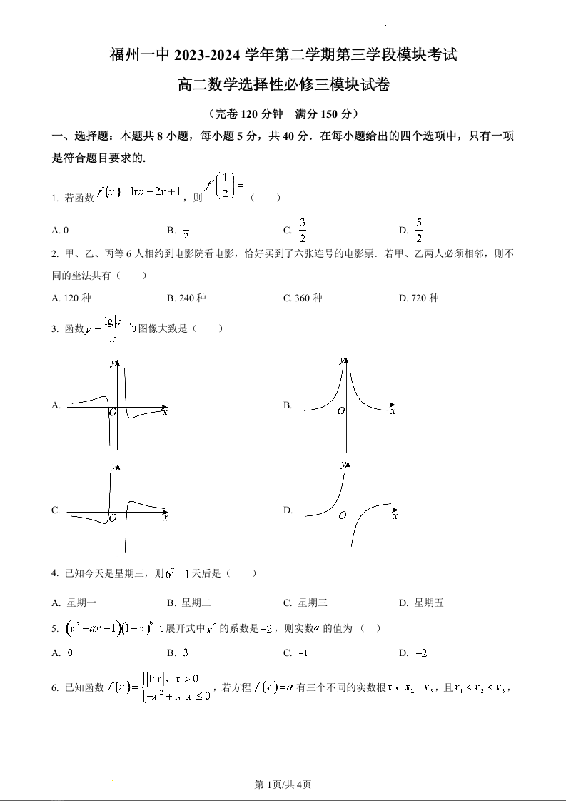 福建省福州第一中学2023-2024学年高二下学期4月期中考试数学(原卷版)