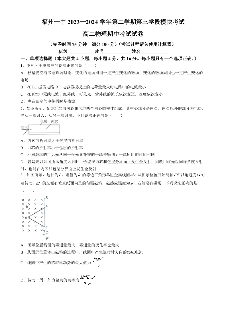 福建省福州第一中学2023-2024学年高二下学期4月期中考试物理