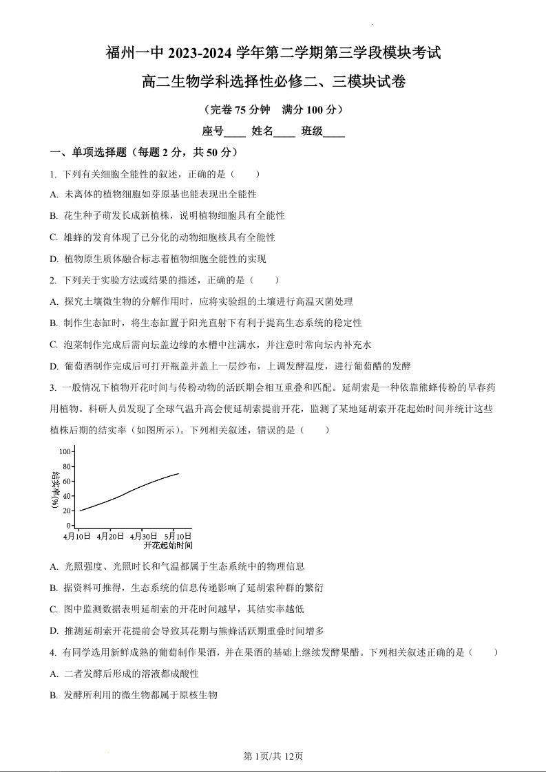 福建省福州第一中学2023-2024学年高二下学期4月期中考试生物(原卷版)
