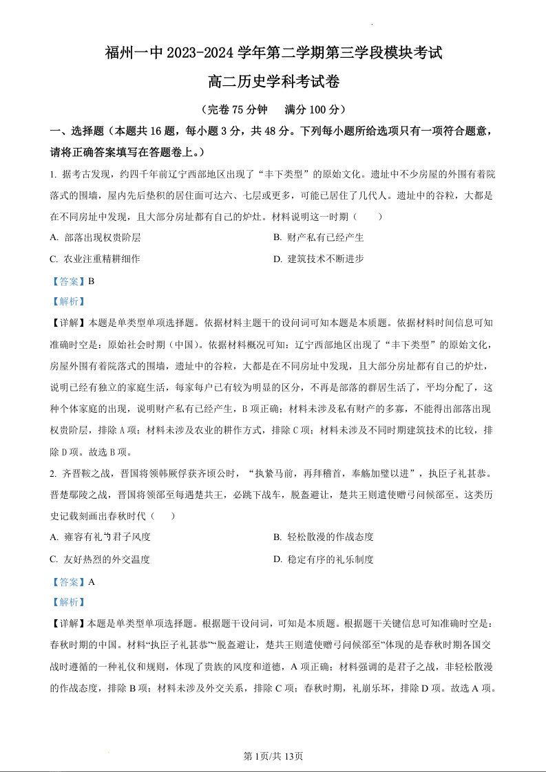 福建省福州第一中学2023-2024学年高二下学期4月期中考试历史(精品解析版)