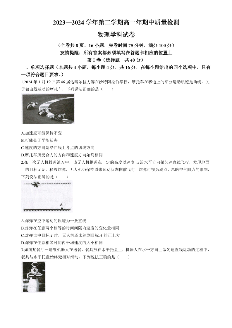 福建省福清市2023-2024学年高一下学期期中考试物理试题
