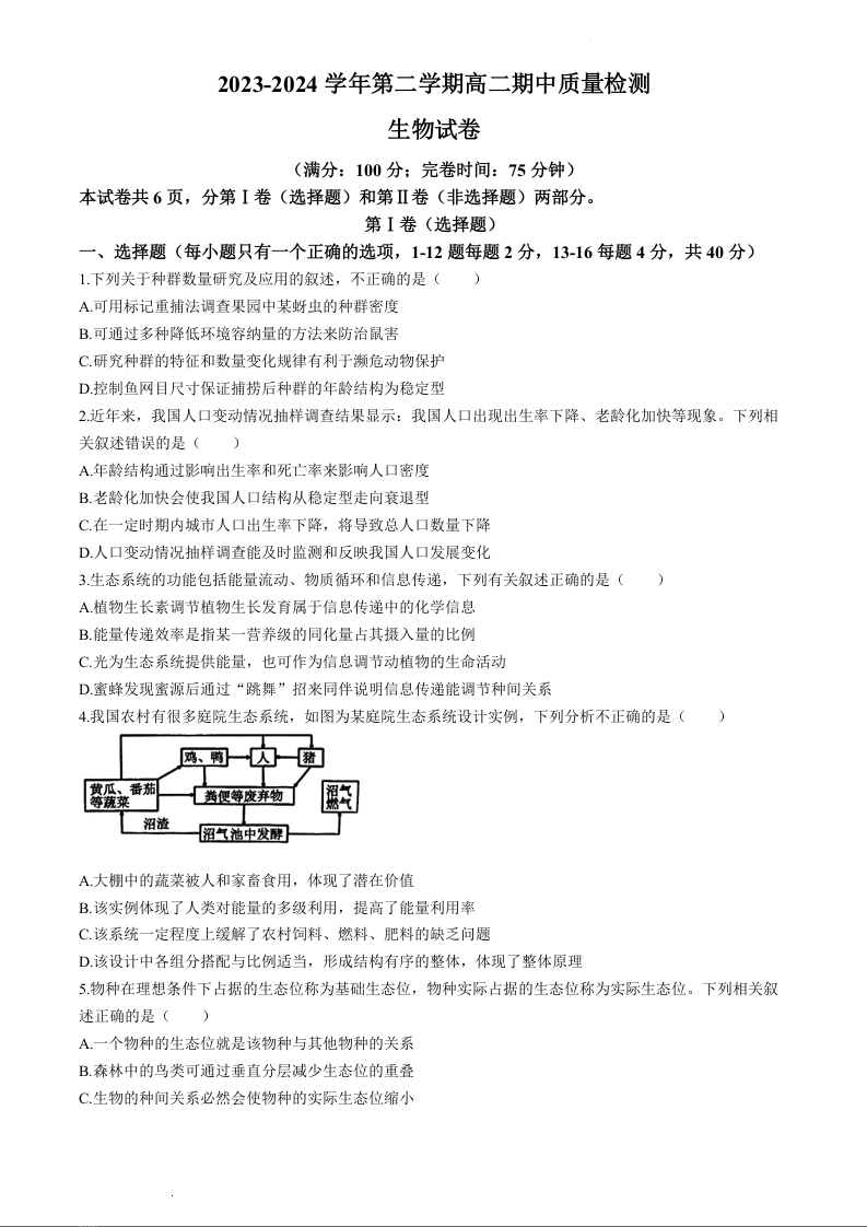福建省福州市福清市2023-2024学年高二下学期期中考试生物试题