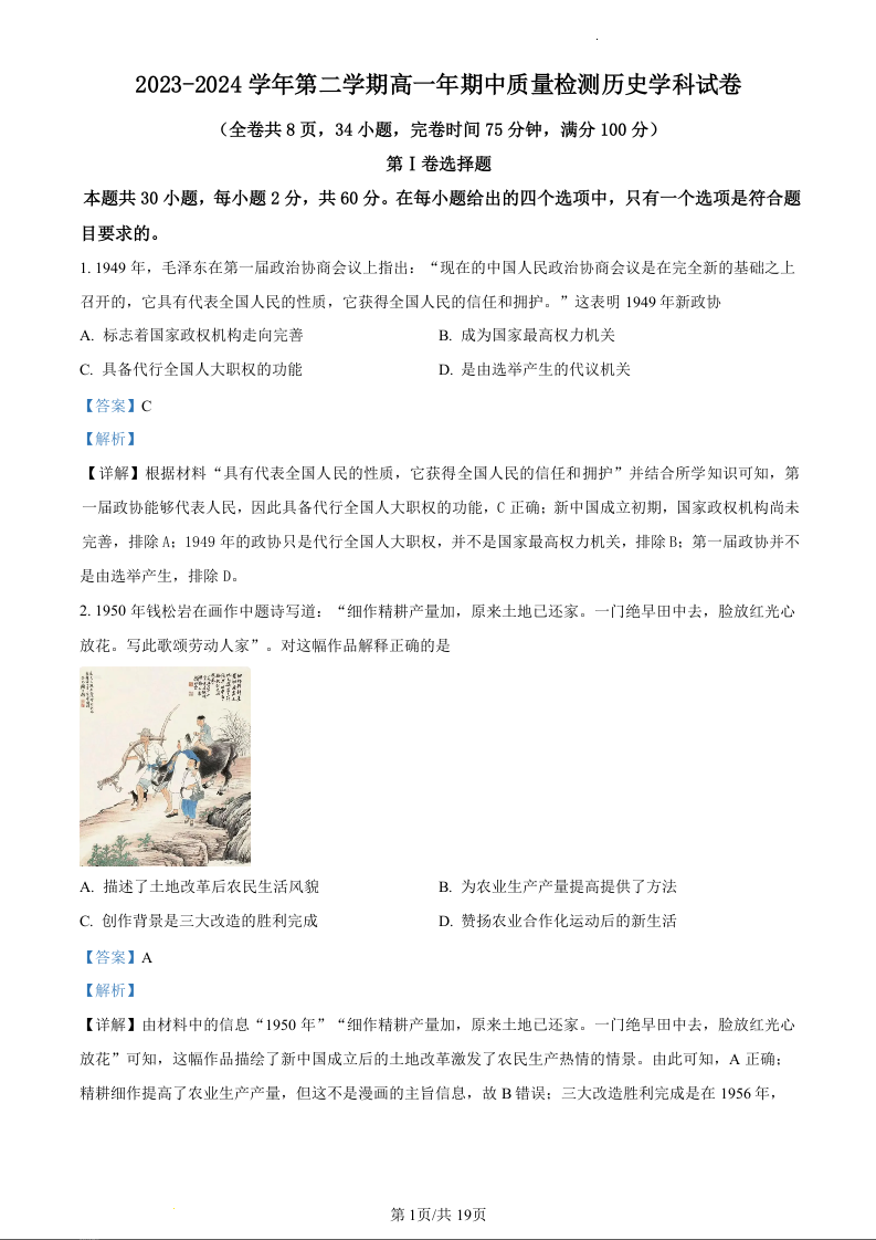 福建省福州市福清市2023-2024学年高二下学期期中考试历史(精品解析版)