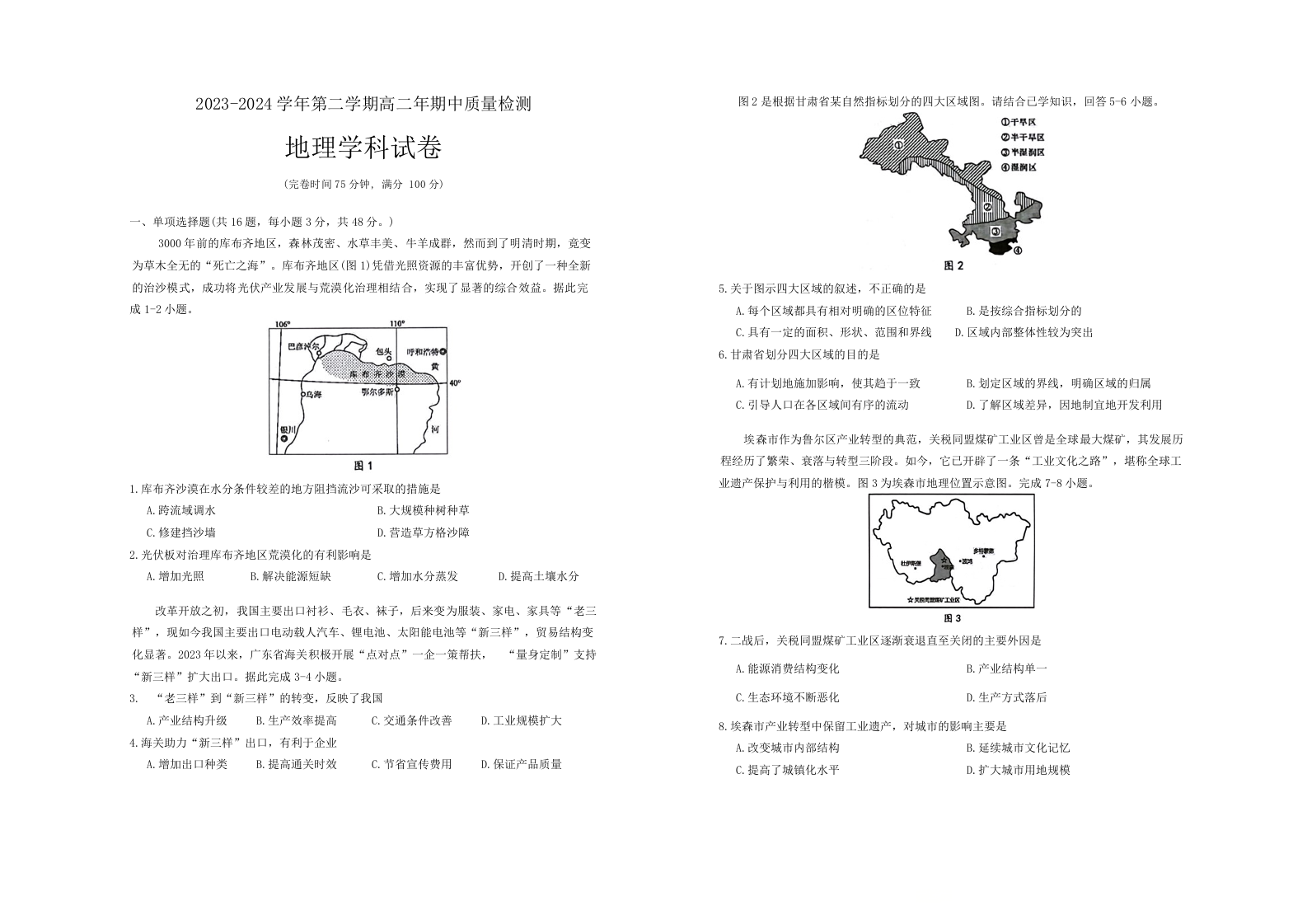 福建省福州市福清市2023-2024学年高二下学期期中考试地理