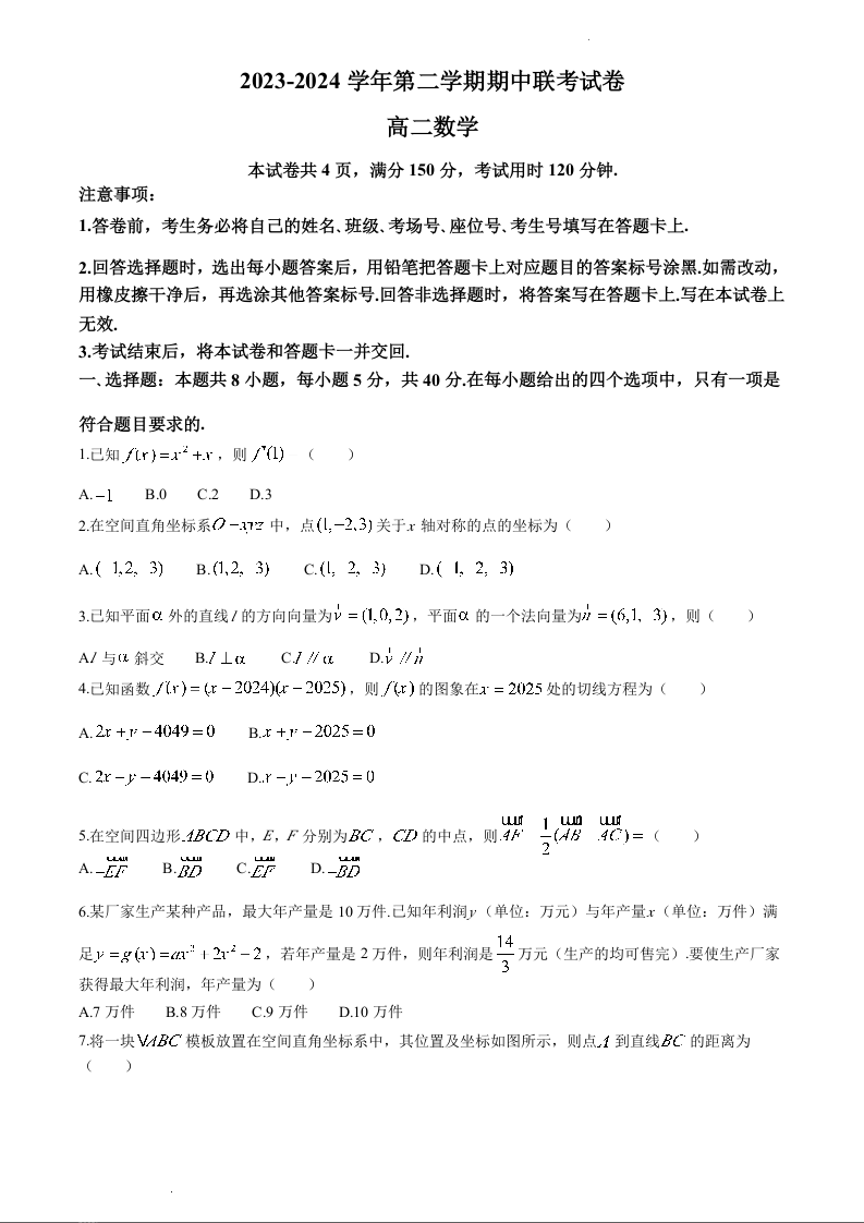 甘肃省天水市2023-2024学年高二下学期5月期中考试数学+答案