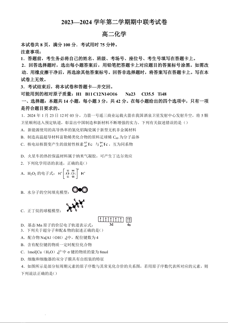 甘肃省天水市2023-2024学年高二下学期5月期中考试化学+答案