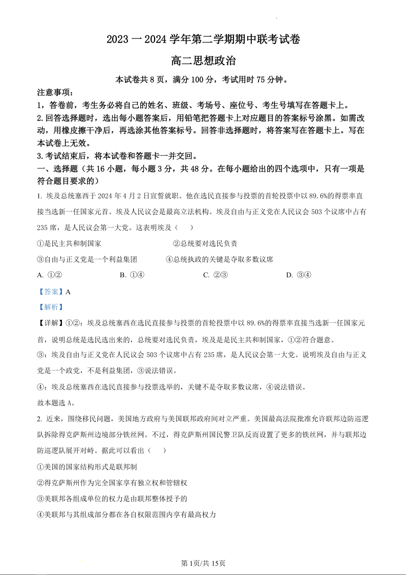 甘肃省天水市2023-2024学年高二下学期5月期中考试政治(精品解析版)