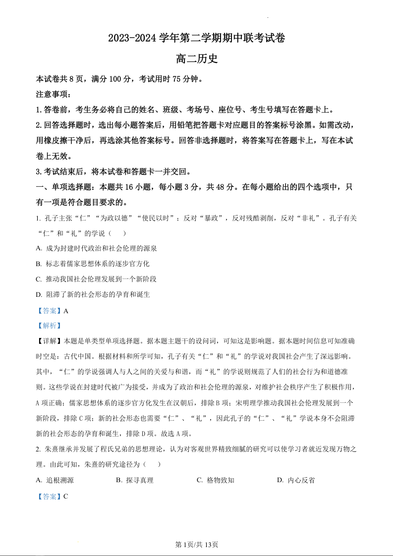 甘肃省天水市2023-2024学年高二下学期5月期中考试历史(精品解析版)