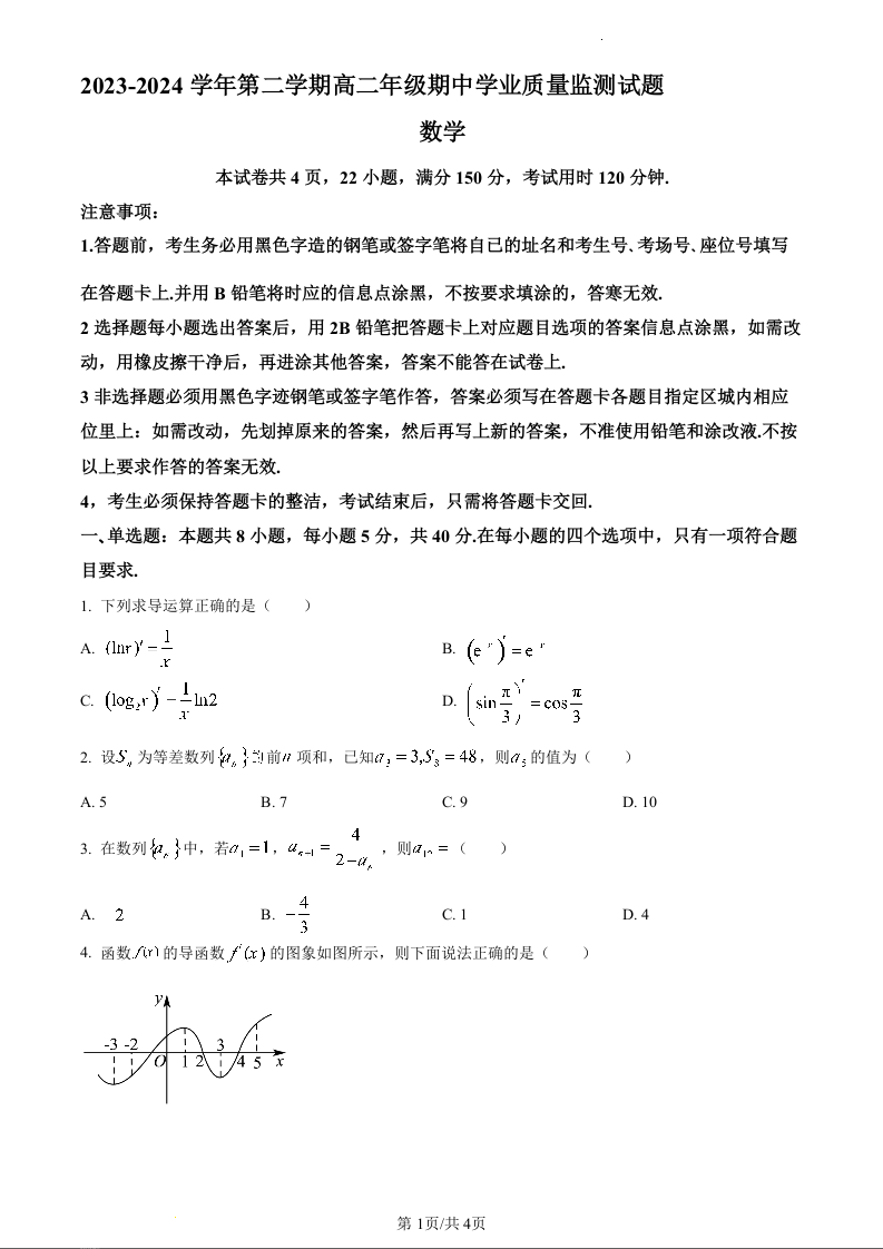 广东省珠海市六校2023-2024学年高二下学期期中联考数学(原卷版)