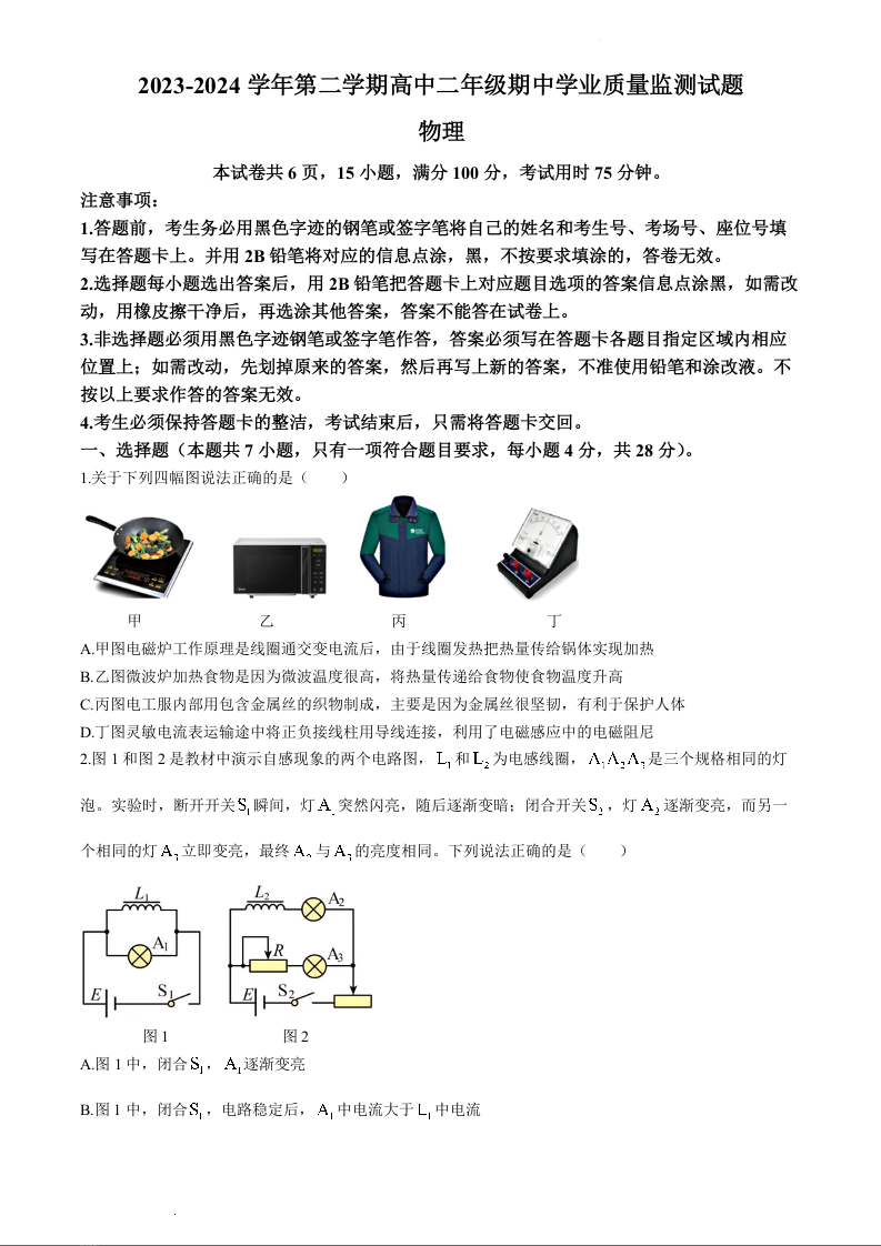 广东省珠海市六校2023-2024学年高二下学期期中联考物理+答案