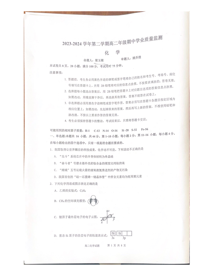 广东省珠海市六校2023-2024学年高二下学期期中联考化学