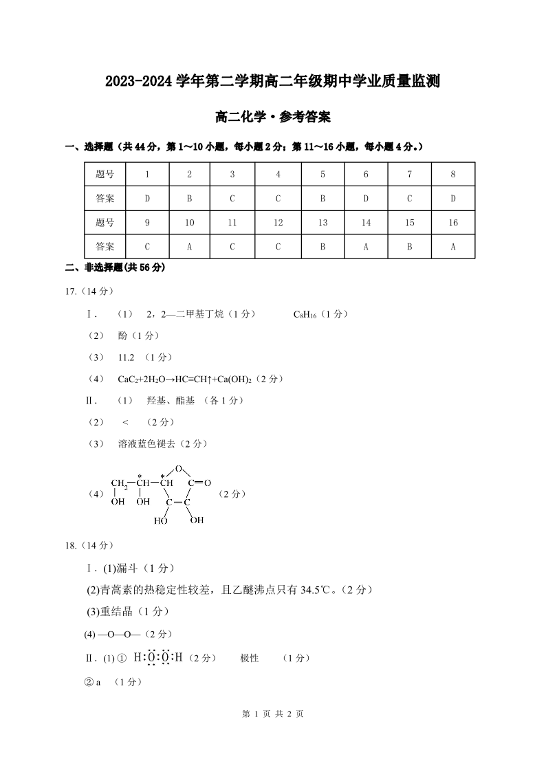 广东省珠海市六校2023-2024学年高二下学期期中联考化学答案