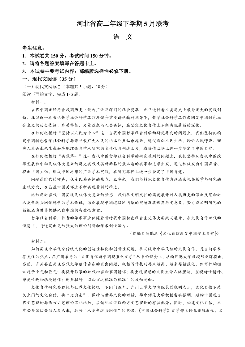 河北省保定市部分示范性高中2023-2024学年高二下学期5月期中考试语文