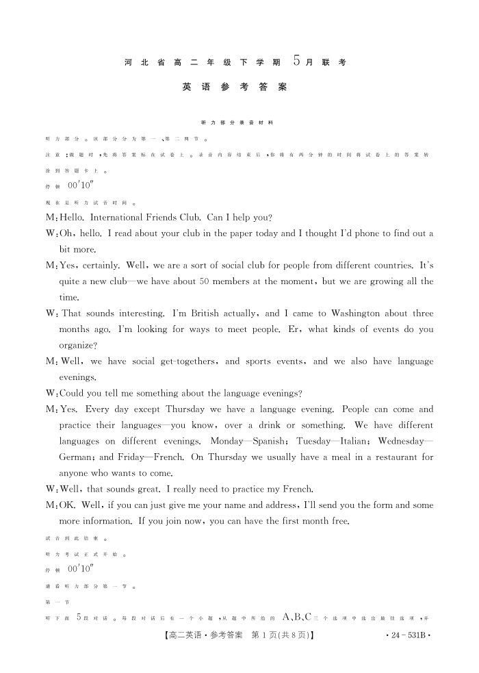 河北省保定市部分示范性高中2023-2024学年高二下学期5月期中考试英语答案