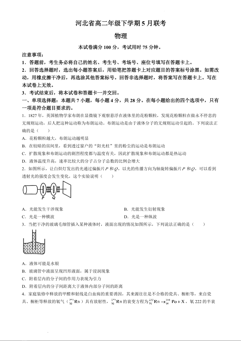 河北省保定市部分示范性高中2023-2024学年高二下学期5月期中考试物理+答案