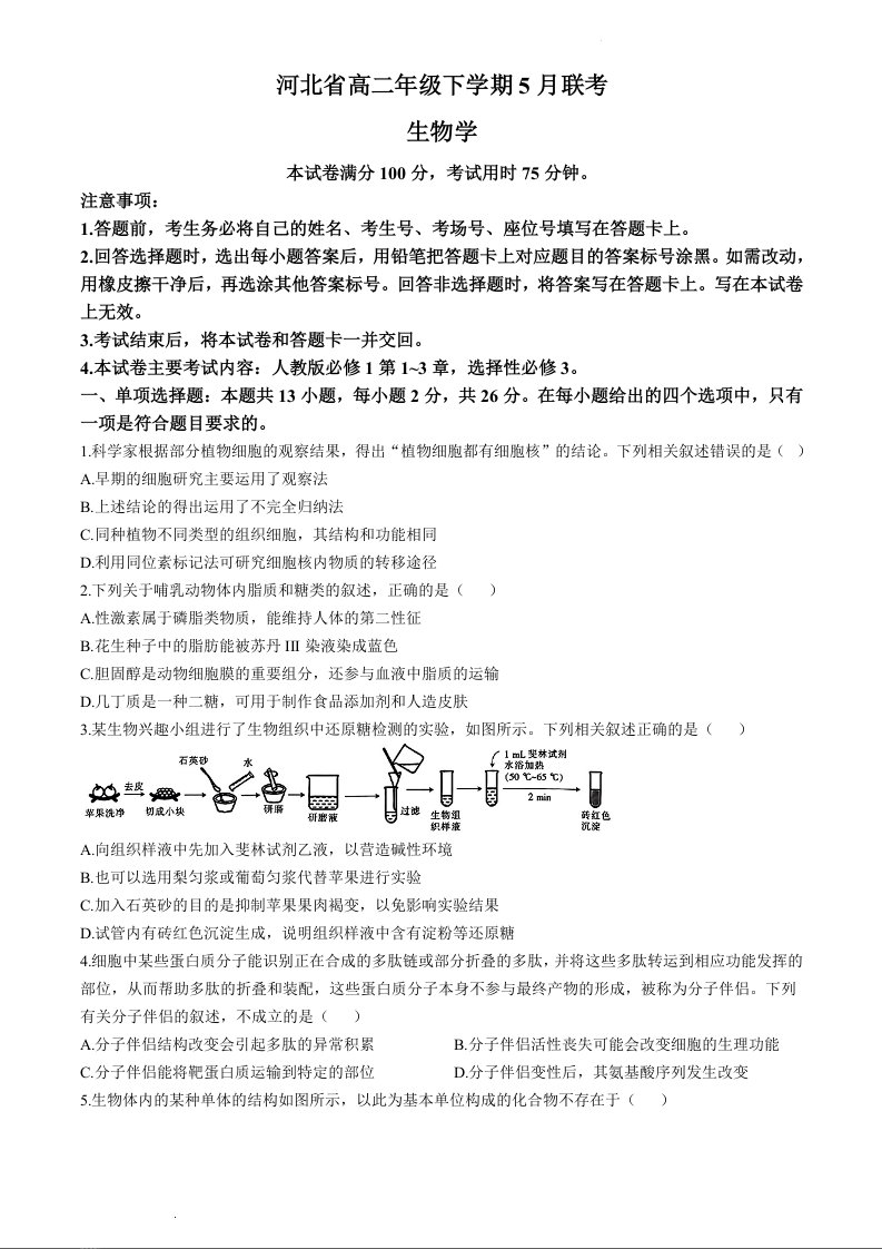 河北省保定市部分示范性高中2023-2024学年高二下学期5月期中考试生物+答案