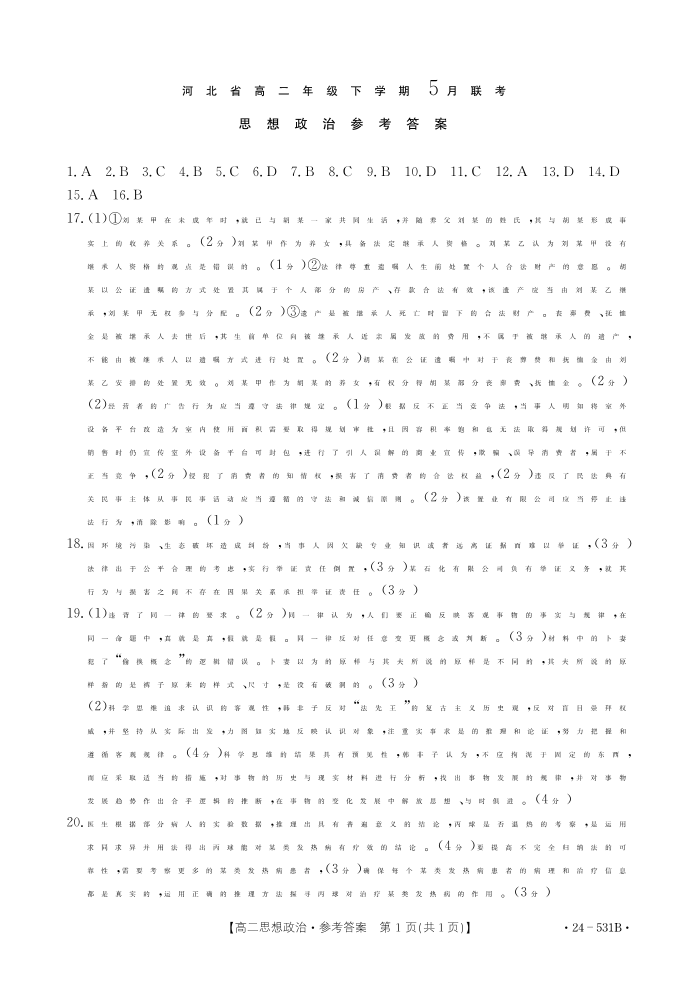 河北省保定市部分示范性高中2023-2024学年高二下学期5月期中考试政治答案