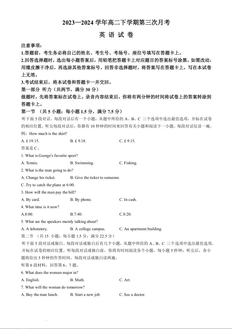 河南省创新发展联盟2023-2024学年高二下学期5月月考英语+答案