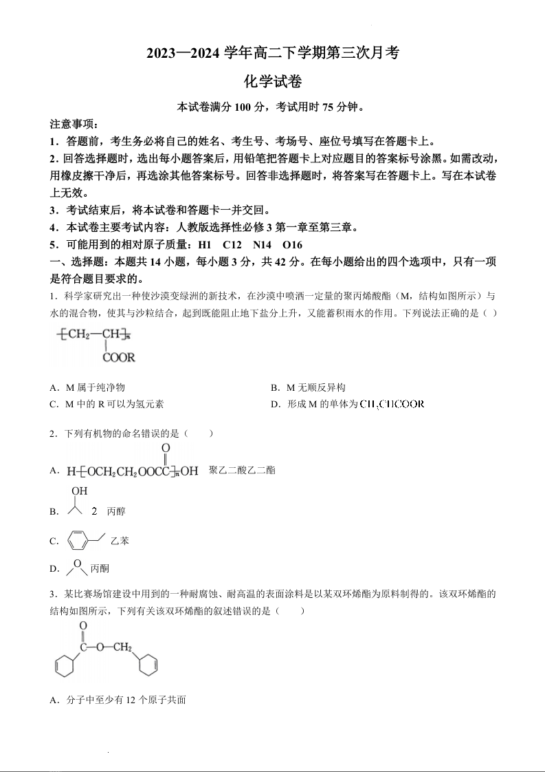 河南省创新发展联盟2023-2024学年高二下学期5月月考化学+答案