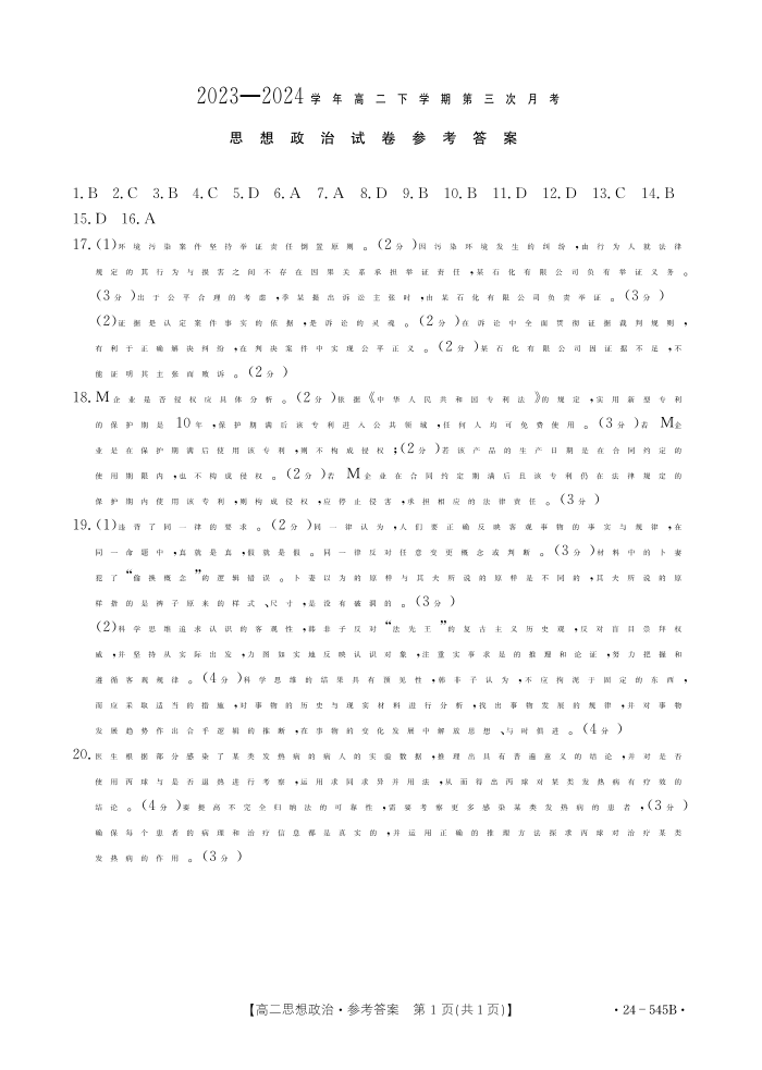 河南省创新发展联盟2023-2024学年高二下学期5月月考政治答案