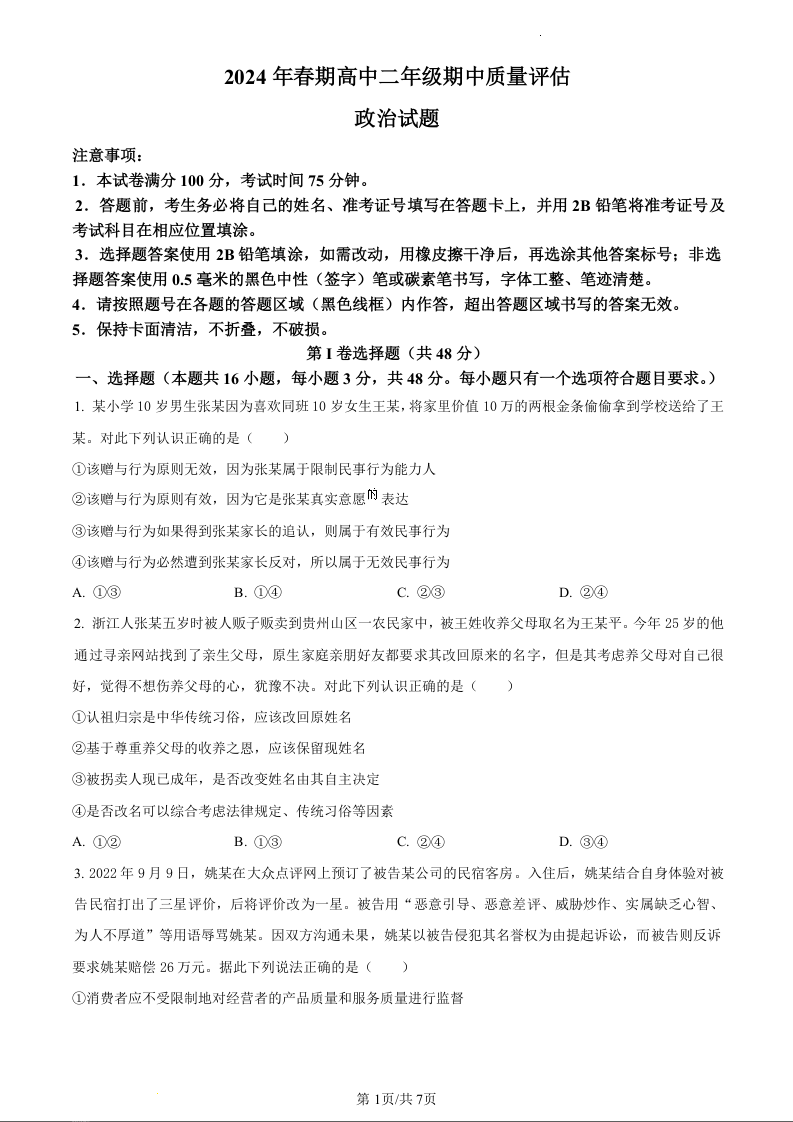 河南省南阳市2023-2024学年高二下学期期中考试政治(原卷版)