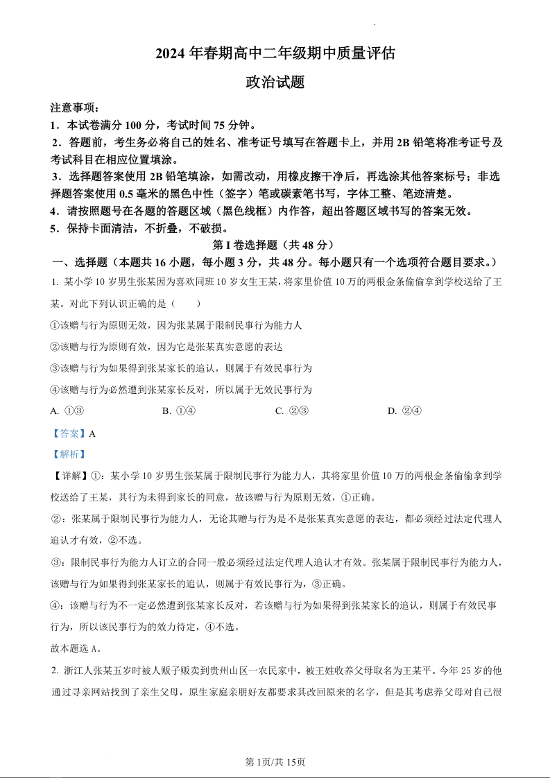 河南省南阳市2023-2024学年高二下学期期中考试政治(精品解析版)