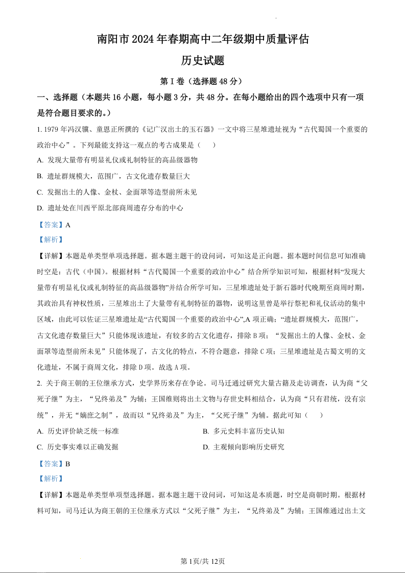 河南省南阳市2023-2024学年高二下学期期中考试历史(精品解析版)