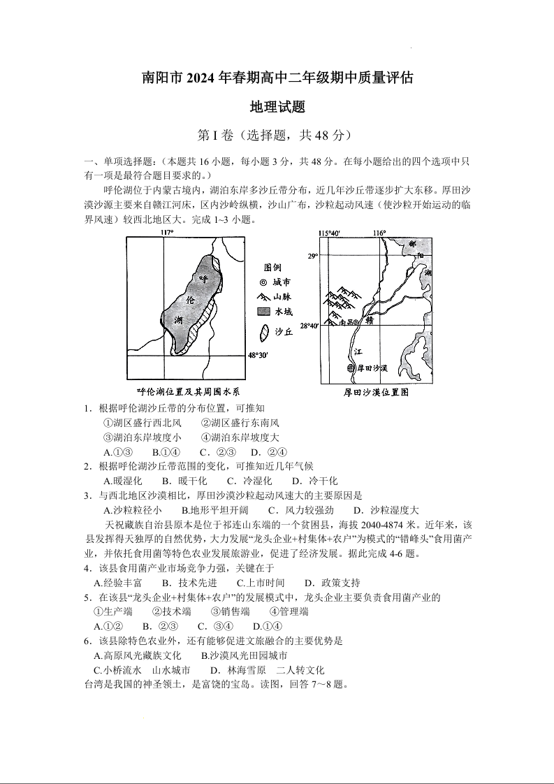 河南省南阳市2023-2024学年高二下学期期中考试地理+答案