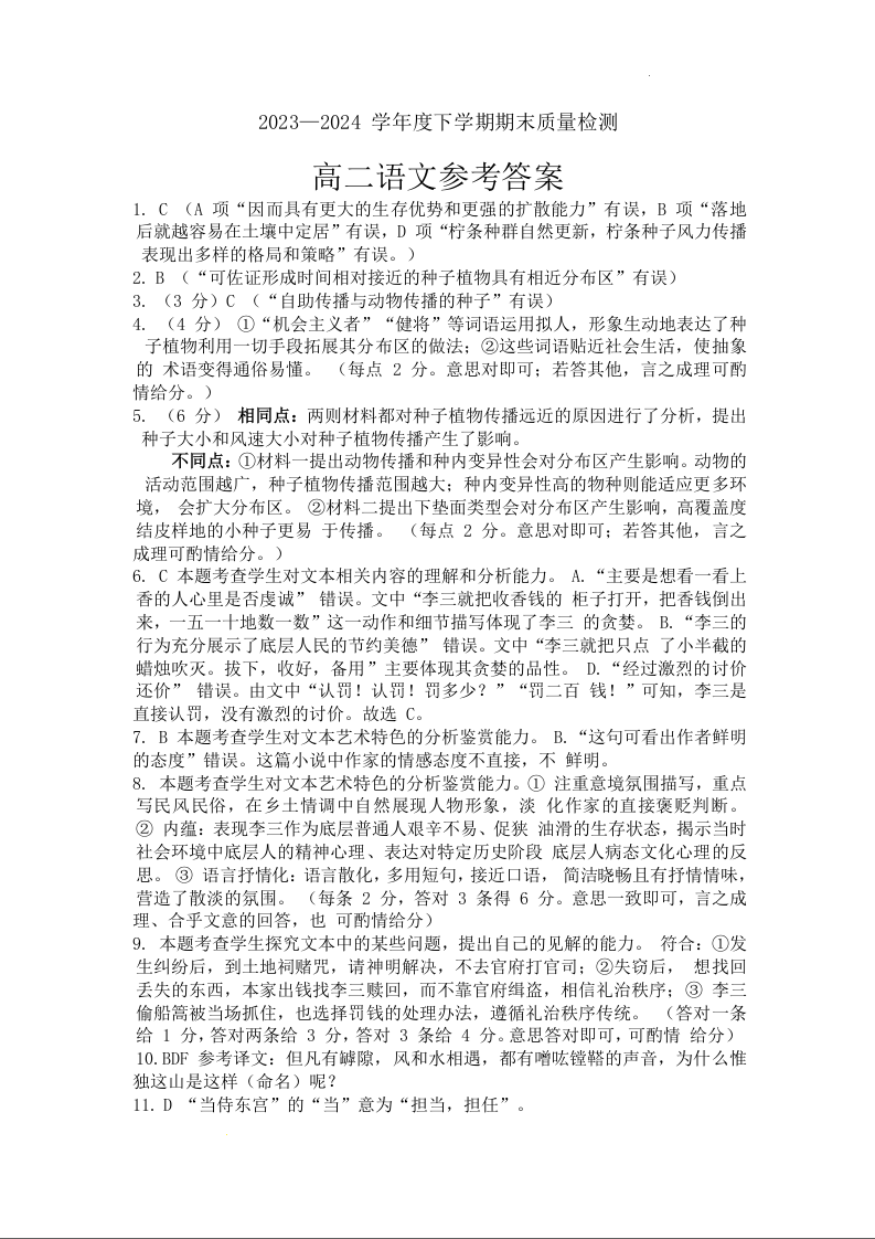 河南省三门峡市2023-2024学年高二下学期5月期末质量检测语文答案