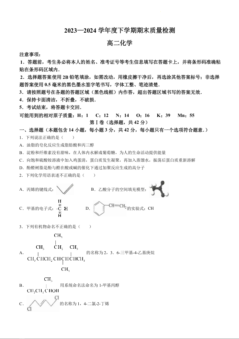河南省三门峡市2023-2024学年高二下学期5月期末质量检测化学+答案