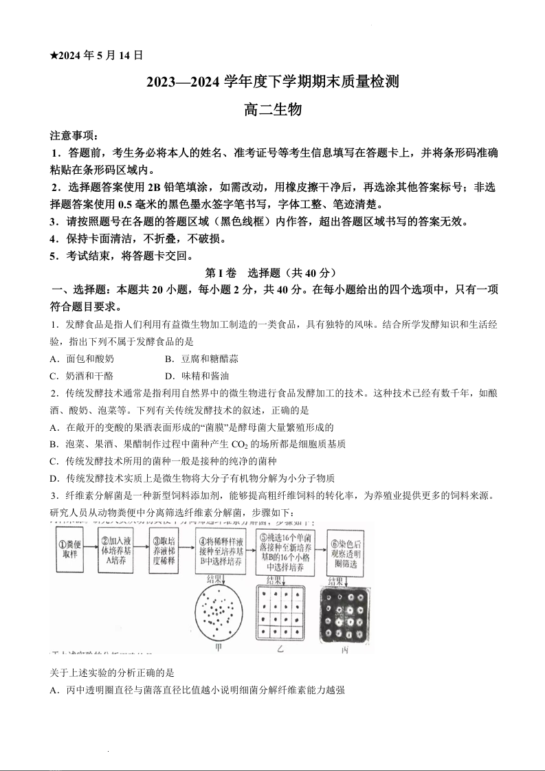 河南省三门峡市2023-2024学年高二下学期5月期末质量检测生物+答案