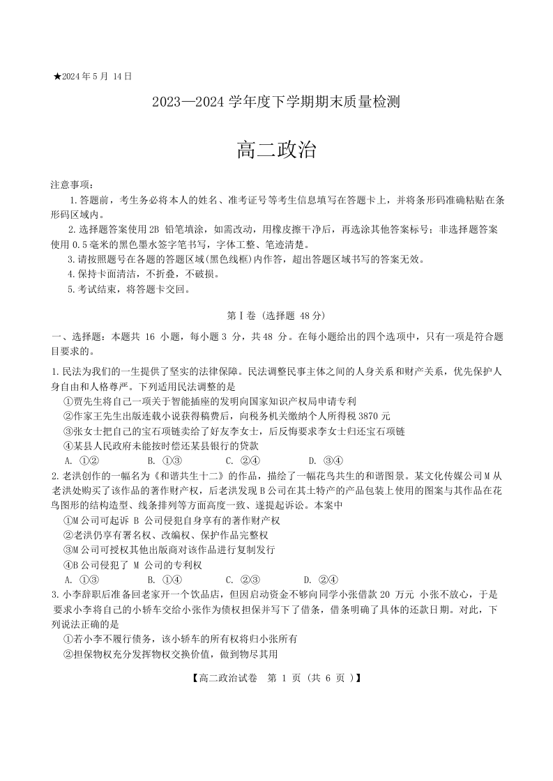 河南省三门峡市2023-2024学年高二下学期5月期末质量检测政治