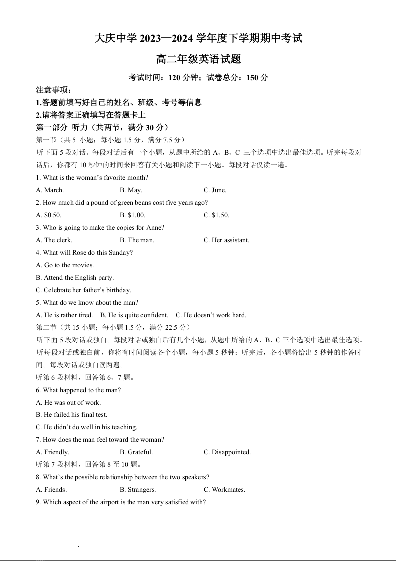 黑龙江省大庆市大庆中学2023-2024学年高二下学期5月期中考试英语+答案