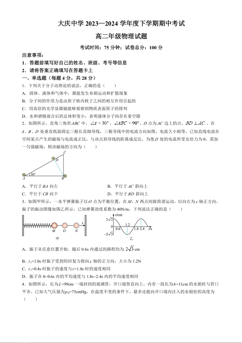 黑龙江省大庆市大庆中学2023-2024学年高二下学期5月期中考试物理+答案