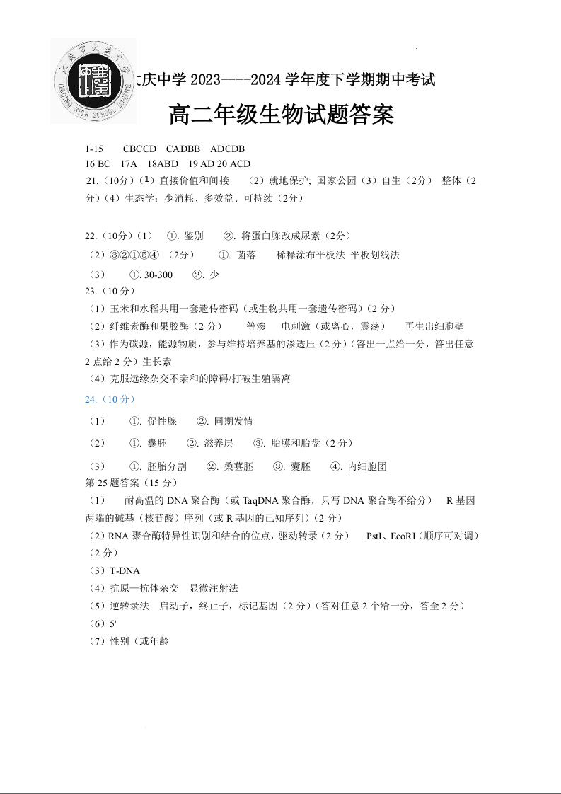 黑龙江省大庆市大庆中学2023-2024学年高二下学期5月期中考试生物答案