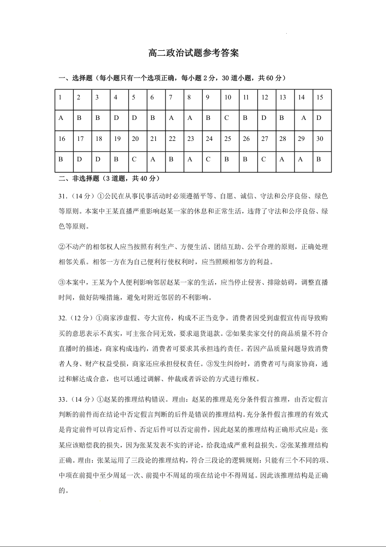 黑龙江省大庆市大庆中学2023-2024学年高二下学期5月期中考试政治答案