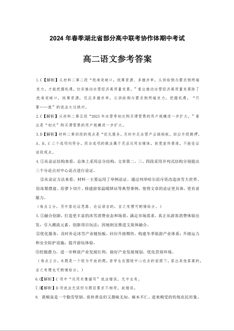湖北省部分高中联考协作体2023-2024学年高二下学期期中考试语文答案
