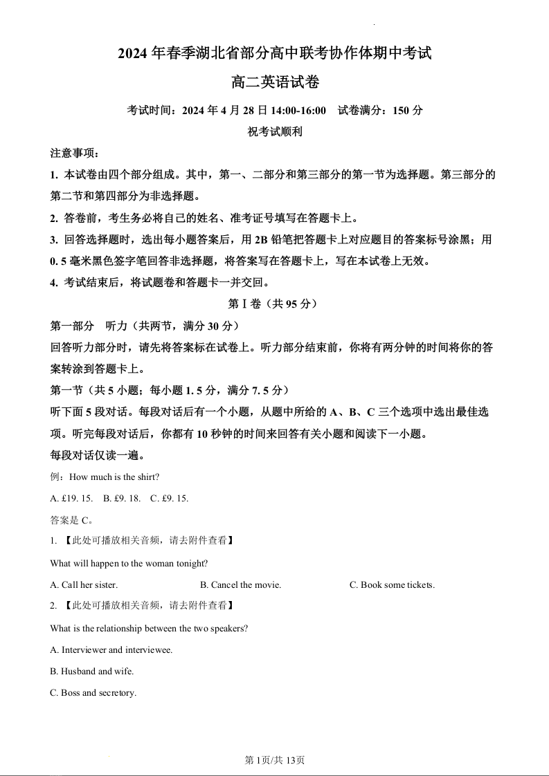 湖北省部分高中联考协作体2023-2024学年高二下学期期中考试英语(原卷版)