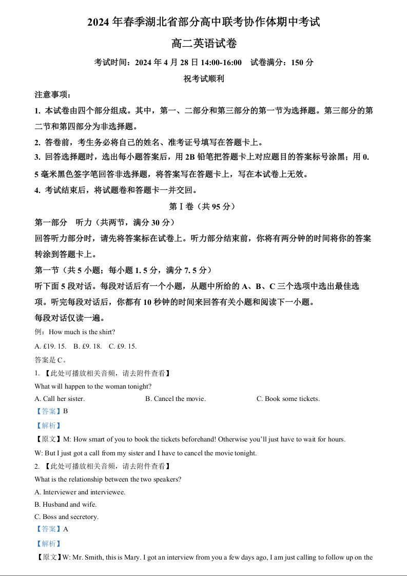 湖北省部分高中联考协作体2023-2024学年高二下学期期中考试英语(精品解析版)