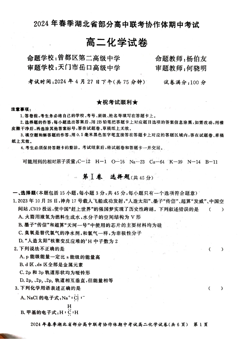 湖北省部分高中联考协作体2023-2024学年高二下学期期中考试化学