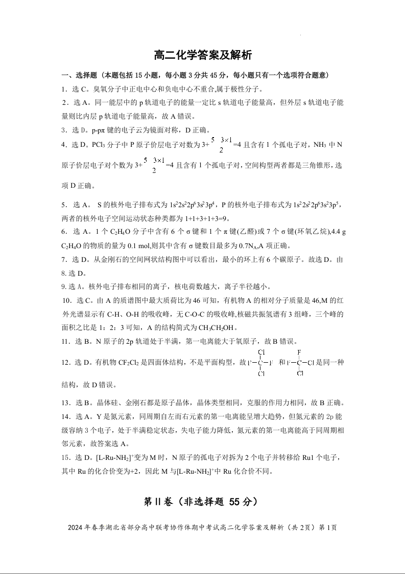 湖北省部分高中联考协作体2023-2024学年高二下学期期中考试化学答案