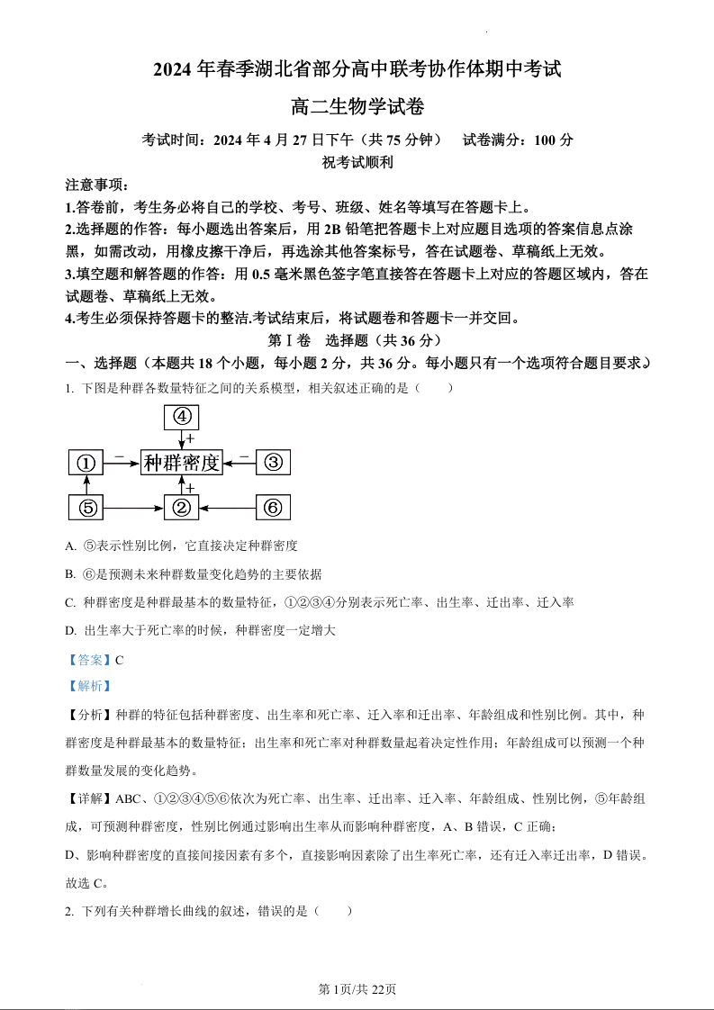 湖北省部分高中联考协作体2023-2024学年高二下学期期中考试生物(精品解析版)